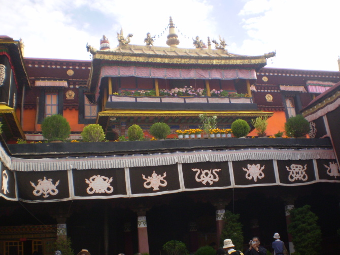 29日上午9点我们参观的第一站就是大昭寺和八角街,在大昭寺的门前可以看到许多虔诚的藏传佛教信徒们在磕长头,还有上了年龄的藏族佛教信徒们,他们手持转经轮围着大昭寺转,看的出他们才是真正的宗教信奉者。在大昭寺内,到处可见金币辉煌的佛塔和唐塔画,这是藏族特有的一种画,画面多为佛教画,画料都是当地特产的矿物质所配制而成的,据说是千年不变色,至于大昭寺内所涵盖的佛教知识及其所具有的佛法的神灵,我都不懂,只知道大昭寺是松赞干布为迎娶尼泊尔公主为妻所盖,文成公主进藏时所带的12岁释迦牟尼等身像就供奉在大昭寺内。大昭寺又名“祖拉康”,藏语意思是经堂。“大昭”,藏语为“觉康”,意思是释迦牟尼,就是说有释迦牟尼像的佛堂,它在佛教界具有至高无上的地位。