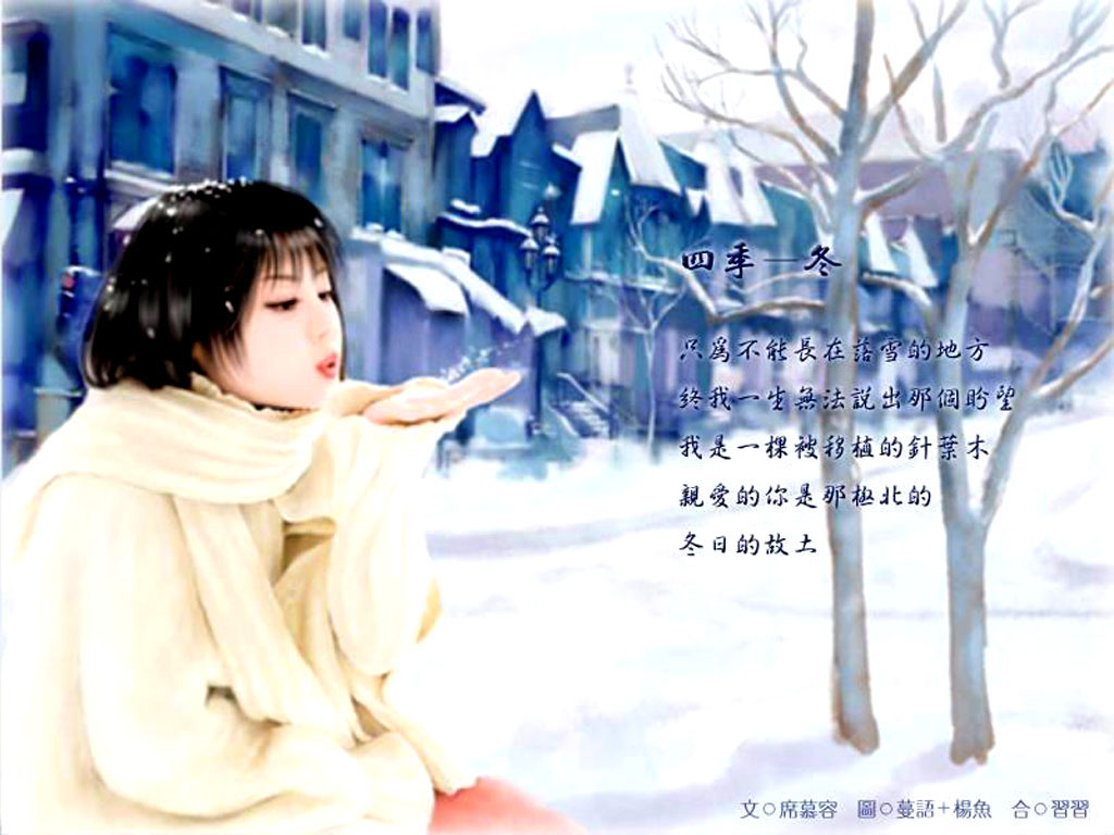 畅想着雪的无暇和温柔,感动着雪似水的柔情和晶莹剔透的真诚,钟情着雪涤荡污浊的情操……遥想着闲情的张岱藏雪烹茶的情景,向往着洒脱的孟浩然风雪中踏雪寻梅的雅兴,翩跹的思绪折枝为笔,和着天地的神韵,蘸着季节的色彩,随着满怀的诗意灵感在大地的宣纸上,用着雪的幽雅和婉约自如地书写着:“白雪却嫌春色晚,故穿庭树作飞花”,“玉树舞琼英,疑是梨花弄,“不知庭霞今朝落,疑是林花昨夜开”……